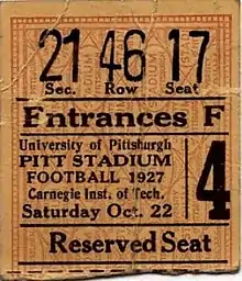 The athletic department sold 1927 football season ticket booklets to alumni, bondholders, faculty members and student family members for the first time.[28][29] Children under 16 could join the Pittsburgh Post-Gazette Fair Play Club and get a 25 cent ticket that was good for a ride on the trolley to the game, entrance to the game and then a ride home on the trolley after the game.(see photo)