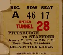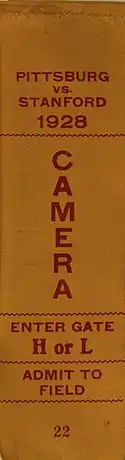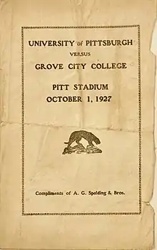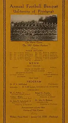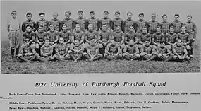 The 1927 Pittsburgh Panthers football team was an American football team that represented the University of Pittsburgh as an independent during the 1927 college football season. In its fourth season under head coach Jock Sutherland, the team compiled an 8–1–1 record, shut out seven of its ten opponents, suffered it sole loss to Stanford by a 7–6 score in the 1928 Rose Bowl, and outscored all opponents by a total of 285 to 27.[1][2] The team played its eight home games at Pitt Stadium in Pittsburgh. Pitt sports fans were treated to a superb 1927-28 athletic program as four Panther teams finished their seasons undefeated - football, basketball, track and swimming.[3] The team was ranked No. 2 in the nation in the Dickinson System ratings released in December 1927.[4]