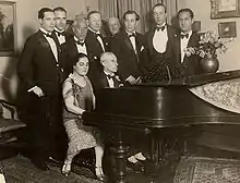 Maurice Ravel at the piano with Éva Gauthier in 1928; George Gershwin listens at right.