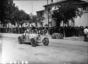 Held in the middle of the racing season, the European Championship was three races run over seven weeks. It started in June with the Italian Grand Prix held at Monza. Running to the new 5-hour AIACR regulations, fifteen cars took the grid. Alfa Romeo unveiled its sensational new model, the Tipo B monoposto, for Nuvolari and Campari, while Borzacchini and Caracciola ran the race-proven 8C-2300. They were supported by two more Monzas, for Scuderia Ferrari's Pietro Ghersi and Eugenio Siena. Maserati gave its 5-litre V5 to Fagioli, and Ruggeri had the 8C model, now bored out to 2.8-litres. Bugatti similarly gave their premier drivers, Varzi and Chiron, the big-engined Type 54 and Divo ran a Type 51. The field was completed with privateers Lehoux and Dreyfus in Bugattis and Castelbarco and Premoli with Maserati.[106] From the start, the race was a close and exciting tussle between the works cars with positions changing constantly. Caracciola was an early casualty losing a quarter-hour with a faulty magneto. Approaching the first hour, after 15 laps, Fagioli had a narrow lead over Nuvolari, followed by Campari and Varzi with Chiron who was only 30 seconds behind in fifth. Over the next half-hour, cars started pitting for fuel and tyre changes. Soon after, Borzacchini now running fourth, was hit in the head by a stone thrown up by a car he was overtaking. He made it back to the pits, bloodied, and was relieved by reserve driver Marinoni. Then Varzi pitted with a ruined transmission. Worse, a lap later, his teammate Chiron crept into the pits. After losing time clearing blocked fuel lines, Varzi took the car back out.[107][54][51] After two hours it was Nuvolari, Campari and Fagioli each 30 seconds apart and a lap ahead of Marinoni, Dreyfus and Siena. But on lap 50 Campari pitted to change tyres and lost 8 minutes when he could not get re-started. An exhausted Fagioli pitted on lap 60 for more tyres and fuel, but spent over 4 minutes stationary before handing over to Ernesto Maserati. Recovered, Fagioli took his car back over again after ten laps. He set some blistering times trying to make up the lost time and gradually reeled in the cars ahead of him to a thrilling finish. But Nuvolari, and his new Tipo B, had not missed a beat. Unlike most others, he drove on without relief to take the victory. Fagioli finished second, a lap behind. Despite behind faster he was stymied by poor pitwork, losing over eleven minutes to the Alfas who pitted for a fraction of that time. A great day for Alfa Romeo was cemented by Borzacchini (assisted by Marinoni and Caracciola) and Campari taking third and fourth with the privateer Bugatti of Dreyfus in an excellent fifth, all on the same lap. Nuvolari's normally shy and retiring wife, Carolina, was asked to anoint him with the winner laurel wreath in front of an ecstatic crowd.[108][54][109]