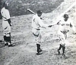 Ruth is congratulated by Gehrig after hitting his "called shot." Gabby Hartnett, the Cubs catcher, watches.