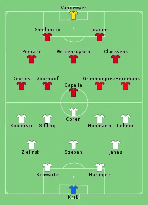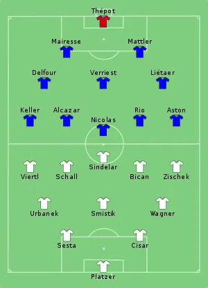 France took the lead with a goal from Jean Nicolas, who had suffered a head injury in the early stages of the match. Austria drew level on the brink of half time thanks to a goal from the star Matthias Sindelar. An uneventful second half followed, so the match became the first in the history of World Cup to go to extra time. In the extra time, Austria prevailed and scored twice before France got a late second goal from the spot.[2]