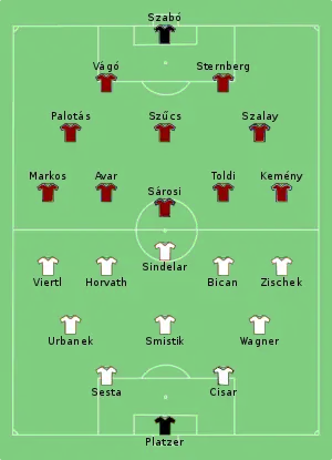An extremely tough game prevented the two teams from truly showing the technical skills they possessed. Austria took an early lead with Johann Horvath, who finished a well-organised team move. Austria doubled their lead in the early stages of the second half. Shortly after, Hungary got one back thanks to a penalty caused by Karl Sesta. The match hung in the balance until Hungary lost two players: Imre Markos was red carded and István Avar got injured. After that, Austria comfortably cruised to the victory.[2]