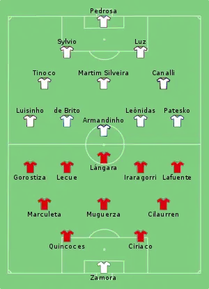 Brazil – who had only kept Carvalho Leite from the squad participating in the previous edition of the World Cup – were outclassed by Spain in the first half, who scored thrice. In the second half, Spanish players played more complacently. Leônidas pulled one back for Brazil, then he scored again moments later, but the goal was disallowed for offside. Later, Ricardo Zamora saved a penalty from Waldemar de Brito.[2]
