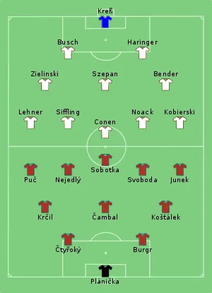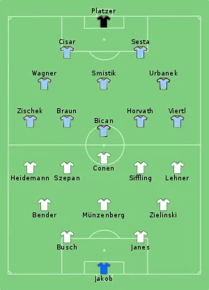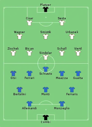 Both teams changed their usual line-ups, resting several players. Austrian players wore an unusual light blue jersey borrowed from Napoli because of the clash of colours between the two traditional jerseys. Germany took the lead inside 25 seconds with the fastest goal of the tournament, scored by Ernst Lehner. They doubled the lead with Edmund Conen, but Austria got one back immediately after with Johann Horvath. Germany's third goal came after Karl Sesta attempted to sit on the ball to ridicule a German player; the ball was stolen by Conen, who crossed to Lehner. Sesta then scored a goal, but Germany held on for the victory.[2]