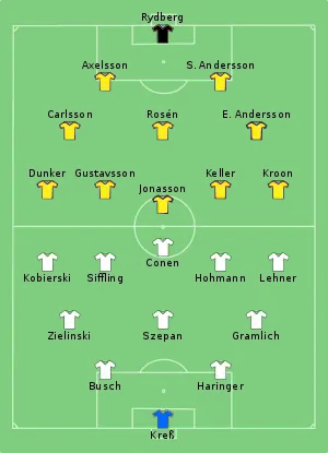Pouring rain influenced the match, which saw very few notable moments in the first half. In the second half, Ernst Andersson suffered a head injury, and Germany took the lead with Karl Hohmann while the Swedish player was off. Hohmann scored again three minutes later. Sweden managed to get a goal back, but their subsequent efforts were not enough and Germany progressed to the first of many semi-finals.[2]