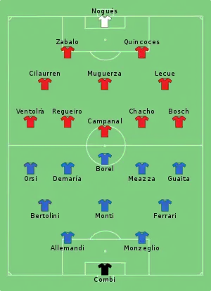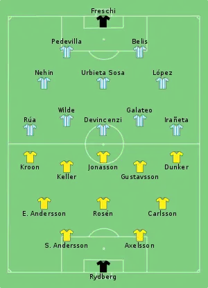Argentina proved a shadow of the team that was finalist in the 1930 World Cup. In fact, they presented a roster of newcomers as only Alfredo Devincenzi and Arcadio López were previously capped by the team. Argentina took the lead with a 25-yard free kick by Ernesto Belis. A more organised Sweden team soon equalized with Sven Jonasson. Argentina showed an excellent attacking prowess and went ahead again with an individual effort from Alberto Galateo. However, an efficient Sweden team took advantage of the defensive weakness of Argentina to score twice before the final whistle and hold on for the victory.[2]