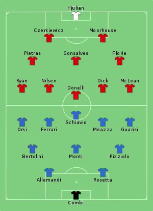 A superior Italian team had a comfortable victory against the United States, which had played against Mexico in the qualifying just three days earlier. Schiavo scored two goals in the first half, one of which was from more than 30 yards out. A good performance from the US goalkeeper Julius Hjulian did not prevent Italy scoring seven goals before the final whistle.[2]
