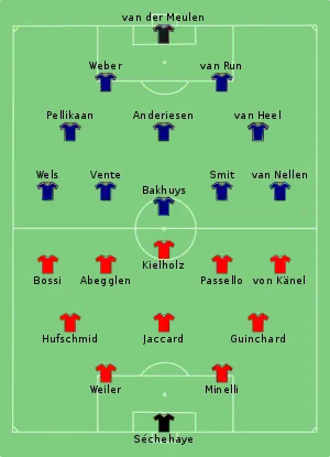 Netherlands were narrowly defeated by Switzerland. Switerzland took an early lead thanks to Leopold Kielholz finishing off a good piece of play from André Abegglen. Netherlands equalised with Kick Smit, who converted a free-kick by Puck van Heel. Kielholz restored the Swiss advantage before half-time with a long-range effort. After the interval, the lead was extended thanks to Abegglen's goal. Netherlands frequently threatened the Swiss goal, scoring one from a free-kick, but Switzerland held on for the victory.[2]