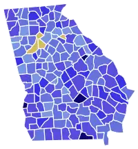 Under the county unit system, the 159 counties in Georgia were divided by population into three categories. The largest eight counties were classified as "Urban", the next-largest 30 counties were classified as "Town", and the remaining 121 counties were classified as "Rural". Urban counties were given 6 unit votes, Town counties were given 4 unit votes, and Rural counties were given 2 unit votes, for a total of 410 available unit votes. Each county's unit votes were awarded on a winner-take-all basis.[2][3]