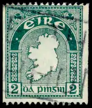 Philatelists refer to the configuration as '"perf 15 x imperf",[4] or in the USA as "perf 15 horizontal", because the stamp is perforated 15 gauge (holes per 2 cm) on the horizontal and imperforate on the vertical edges. Because of the shared design it appears identical to the first 2d value definitive stamp issued on 6 December 1922 with the Map of Ireland except for the imperforate vertical edges.[1] It uses the first Irish watermark that was a stylised design of the two overlapping letters 's' and 'e' making an 'se' watermark representing the name of the country Saorstát Éireann (Irish Free State).[1][5]