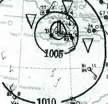 The hurricane originated over the southwestern Caribbean Sea, where, on October 17, a broad and immature low pressure system was noted. The hurricane forecast center in Jacksonville, Florida issued its first advisory on the storm late on October 20, following ship reports of winds approaching and exceeding gale-force.[1] Contemporary reanalyses of the storm have determined that it organized into a tropical depression on October 18, then drifted toward the east, turning north-northeastward as it strengthened into a tropical storm early the next day.[2] Due to low environmental air pressures and the large size of the cyclone, intensification was gradual as the storm approached Jamaica, eventually making landfall on the eastern side of the island, just west of the Morant Point Lighthouse, at 13:00 UTC on October 21. The system came ashore with a central pressure of 995 hPa (29.4 inHg), suggesting maximum winds of 60 mph (100 km/h).[3] After emerging into the waters between Jamaica and Cuba, the storm slowed in forward speed, continued to intensify, and curved northwestward toward southeastern Cuba. The storm attained the equivalent of Category 1 hurricane status on the current-day Saffir–Simpson hurricane wind scale early on October 22, while meandering just off the coast of Cuba.[1][2]