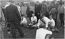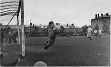 Goalkeeper of Kaunas Military School football (soccer) team, cadet Bronius Jankauskas in action. Training match: Kaunas City football team - Kaunas Military School 3:3 (1:1). Kaunas Military School stadium, 8 May 1935.
