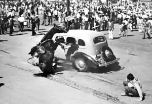 As planned by Campa, a group of young communists confronted the cavalry and threw small fireworks at the horses' legs.[3] The horsemen responded with whipping the youth with their lassos.[2] A small fleet of cars manned by communist drivers, which organized in secret, rammed into the horses in a rapid flanking movement. Several horses and their riders, including Rodríguez Carrasco, rolled across the pavement and were incapacitated. At this moment, the groups began brawling using wooden beams torn from bleachers, stones, and pistols.[2][3] Widescale brawls lasted for about an hour before the police intervened.[6]