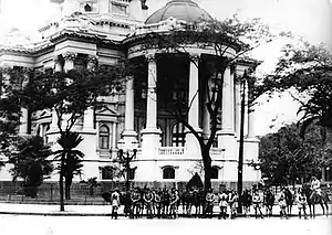 On the morning of 10 November 1937, cavalry of the Federal District police force surrounded the Congress and blockaded the entrance, preventing congressmen from entering.[74] Dutra was against using the Army in this operation.[41][74] One visitor trying to get into the Monroe Palace, the former seat of the Senate, was told by a guard, "When a senator cannot enter, then how can a stranger enter?"[75] As the congressmen were the best paid officials in the state, Vargas claimed he saved money by sending them home.[21] The president of the Senate was informed of his body's dismissal.[64] At 10:00 a.m., copies of the new constitution were printed and distributed amongst the cabinet; they were asked to sign it. The sole dissident, Odilón Braga, the minister of agriculture, resigned immediately and was replaced by anti-Oliveira paulista Fernando Costa.[52][64][76] Dutra, meanwhile, praised the "lofty mission entrusted to the national armed forces".[77] Many military personnel resigned, notably Colonel Eduardo Gomes.[77] Almost every state retained their pre-coup interventors, notably Minas Gerais, where Valadares was the politician most involved with the coup. Interventors in Rio Grande do Sul, São Paulo,[lower-alpha 5] Rio de Janeiro, Bahia, and Pernambuco, however, were replaced.[77]