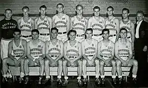 The 1939–40 USC Trojans men's basketball team represented the University of Southern California during the 1939–40 NCAA men's basketball season in the United States. Their head coach was Sam Barry, coaching in his 11th season with the Trojans.[2] The Trojans played their home games in the Shrine Auditorium in Los Angeles, California as members of the South division of the Pacific Coast Conference. The team finished the season 20–3, 10–2 in PCC play to win the South division.[3] They swept North division champion Oregon State in the best of three series to win the PCC championship. USC was invited to the NCAA Tournament where they defeated Colorado before losing to Kansas in the Final Four.[4] Despite the loss, they were named national champions by the Helms Athletic Foundation.[5]