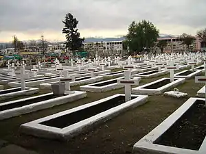 As there was no cemetery at Sewell, the company town on the mountain, all of the miners' bodies were taken to Rancagua in the valley for burial. In addition to compensating the families of the workers financially, Kennecott developed a community here, known as Las Viudas Population (The Widows Community), to provide housing for the many widows and their families.[1] The workers were buried in graves marked by gravestones of the same design. (See image).