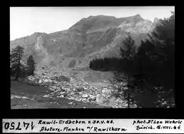 The earthquake immediately disrupted the supply of power in Sierre, and other nearby populated centers in the Valais canton. The tremors caused panic and drove residents out of their homes. Many homes suffered damage to their structure, with chimneys destroyed, detached roof tiles, and broken facades. A newly-constructed church in Chippis partially collapsed and had some of the remaining structures severely damaged and unstable. Desite the severity of damage, with 3,500 buildings damaged, there were very few injuries or deaths reported; three persons suffered fatal shocks and another was crushed to death by a car in Aix-les-Bains, France.[3] Twenty-one rockfalls, one major, occurred. The earthquake also triggered 11 landslides, four avalanches, and a number of ground effects along the Rhône river valley. The landslides and rockfalls reportedly destroyed huts and barns near the mountainside. Damage was also reported in the district of Vaud in Villeneuve. In Château-d'Œx, the quake knocked dispay items onto the ground at an art exhibition.[4] The total damage is estimated at 5.265 million Swiss francs in 1946, or 25.7 million in 2021.[5]