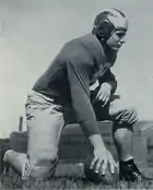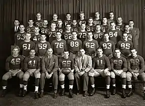 On offense, Michigan was led by a new backfield that included All-American quarterback Pete Elliott and halfbacks Chuck Ortmann and Leo Koceski. The team scored 252 points, an average of 28 points per game.[2] With Ortmann as the principal passer, the Wolverines relied on an air attack, gaining more yards in the air (1,355) than on the ground (1,262). Dick Rifenburg, the team's leading receiver, was picked as a first-team All-American at the end position. Team captain Dominic Tomasi was selected as the team's Most Valuable Player. The 1949 Michiganensian wrote of the 250-pound guard, "Famous for his sharp shattering blocking, Dom tore huge gaps in the opposing lines to pave the way for Michigan's steam roller offense."[3]