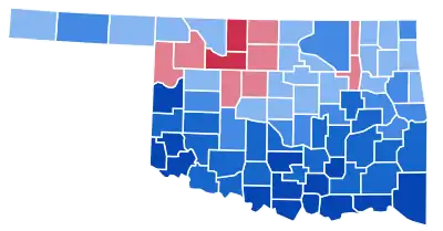 Up to this election, Oklahoma was a reliably Democratic state, with the party winning all but two of the first eleven presidential elections in the state. However, like other states in this Solid South, Oklahoma has since become a Republican bastion. In Dwight D. Eisenhower's landslide elections of 1952 and 1956, Adlai Stevenson II lost every antebellum free-soil or postbellum state, however Oklahoma remained more Democratic than the nation as a whole.[2] In 1960, John F. Kennedy lost most postbellum states, including Oklahoma, due to anti-Catholic sentiment.[3] In 1964, Lyndon Johnson became the last Democratic presidential candidate to carry the state,[4] with only Jimmy Carter in 1976 subsequently reaching even 45% of the vote, and no Democrat after 2000 reaching 35% of the vote or even winning a single county in the state.[5]