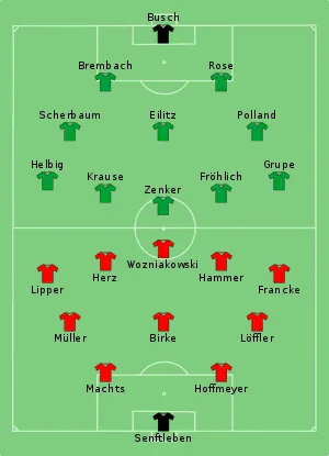 While Chemie Leipzig were able to compete with their starting players, Turbine Erfurt were without defender Helmut Nordhaus and center-forward Wolfgang Nitsche, two important players. Both were suspended due to being disciplined in the international match between East Germany and Poland. Erfurt had another loss to cope with, as twelve minutes into the game, striker Heinz Hammer had to be substituted out due to an injury. Prior to that, Leipzig's attacker Georg Zenker had proven the dangerousness of his team with a good opportunity. At first the game was open, and Erfurt had an opportunity to take the lead in the 25th minute. However, Heinz Wozniakowski's free kick hit the post. Erfurt were thankful for the weak performance of the left attack side of Leipzig of Heinz Fröhlich and Rolf Grupe, and the absence of Nordhaus remained unnoticed for the time being.
