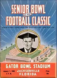 The 1950 Senior Bowl was a college football exhibition game featuring players from the 1949 college football season and prospects in the 1950 NFL Draft. The inaugural edition of the Senior Bowl was played on January 7, 1950, at Gator Bowl Stadium in Jacksonville, Florida.[2] The teams were coached by personnel from the National Football League (NFL); Bo McMillin of the Detroit Lions for the North, and Steve Owen of the New York Giants for the South.[3] The game was broadcast on the Mutual Radio Network.[4] After the North took an early 13–0 lead, the South came from behind for a 22–13 victory.[1] South quarterback Travis Tidwell of Auburn completed 13 of 19 passes for 246 yards and was named game MVP.[5]
