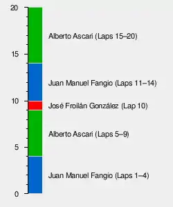 Nino Farina initially took the lead, but, by the end of the first lap, had been passed by Fangio, Ascari and González. Paul Pietsch was running in fifth, but ended up at the back of the field after going off on the second lap. When Farina was forced to retire due to overheating problems, Fangio was left as the sole Alfa Romeo able to take the fight to the Ferrari drivers. Alberto Ascari took the lead on the fifth lap as a result of Fangio's first pitstop, but Fangio returned to the lead when Ascari took to the pits. As the Alfas required two pitstops, as opposed to just one for the Ferraris, Fangio needed to build a large lead in his second stint if he wanted to retain the lead after his second stop. He was unable to do so, therefore Ascari reclaimed the lead on the fifteenth lap of the race. Due to a misbehaving engine and a gearbox with only 3rd and 4th (4th being the highest gear), Fangio was unable to take advantage of an unexpected tyre change for Ascari, meaning that the Italian took his maiden World Championship race victory by over half a minute from Fangio. González completed the podium, with the remaining points positions going to the other works Ferraris of Villoresi and Taruffi.[1]