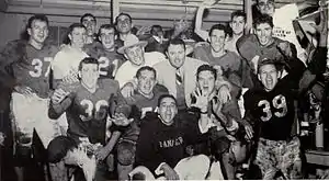 Scarbath was accompanied in the backfield by several other capable players, including "one of the biggest fullbacks in captivity"[10] Ed Modzelewski and halfbacks Chet "the Jet" Hanulak and Ed Fullerton. Halfback Bob Shemonski, the previous season's conference-scoring leader, was shifted to play mostly on defense, but would rank as the team leader in kick returns with six for 126 yards.[5] The Terrapins' line was anchored by co-captains Bob Ward, a guard, and Dave Cianelli, the center. At tackle, it featured Ed's brother, Dick Modzelewski, and Bob Morgan.[12] The defense was described as particularly deep, anchored by Ward, Cianelli, and Jeff Keith, and with good reserves available into even the third string.[10]