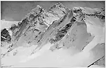 When the 1921 British Mount Everest reconnaissance expedition was exploring the Kama valley to discover whether it afforded a route to Everest from the east, Makalu dominated the southern view. A party led by Charles Howard-Bury on a side excursion reached a 6,600-metre (21,500 ft) peak on the ridge between Makalu and Pethangtse and photographed the scene.[4][note 1] Local inhabitants thought Makalu was higher than Everest because it is much more visible than Everest which is obscured by the surrounding high peaks.[5] In 1933 after two aircraft had flown over Mount Everest and aerial photographs had been taken of the region, The Times published a special supplement with a full-page photograph on the first page entitled "the awe-inspiring summit of Everest as seen slightly from the north-west" – in fact the photograph was of the northwest ridge of Makalu.[6][7] In 1951 and 1952 two British reconnaissance expeditions in Nepal assessed the west face of Makalu from a climbing perspective.[8]