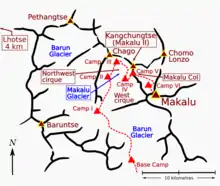 | Base Camp | 4,900[48] | 16,100 | 4 April | Beside moraine of lower Barun Glacier[49] |