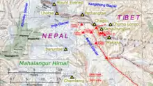 The expedition flew from Orly Airport and arrived in Calcutta on 12 March. Most of the equipment had been sent on ahead. However their oxygen sets were mistakenly transported to Rangoon rather than Calcutta so Couzy had to fly out there to sort things out while Coupé waited behind for him in Dharan with a contingent of porters to catch up the main expedition. From Calcutta the party flew to Biratnagar in Nepal where they met their Sherpas from Darjeeling. They had to deal with custom officers when entering Nepal – the previous year there had been no customs formalities. Gyalzen Norbu could not speak French and had difficulty with English but in Nepalese he was very effective in dealing with matters and organising the Sherpas and porters. A very bumpy road led them by lorry to Dharan – in the 1954 monsoon they had taken three days to cover the thirty miles but this time the journey only took a few hours. Here they met the Sherpas hired from Sola Khumbu together with over a hundred porters from there who had trekked for 15 days across Nepal in the hope of being employed.[32]