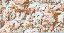 The reconnaissance in 1954 involved finding a suitable approach route up the line of the Arun River and, as well as appointing Sherpas from Sola Khumbu and Darjeeling, they hired local porters in Biratnagar and Sedoa.[note 7] This approach was successful and was also used in 1955. Equipment was tested and, in particular, lightweight crampons with long spikes were found to be a good innovation.[25] The Sherpas' feet were found far to short and wide for their boots to fit satisfactorily so they took templates for boots to be specially made for the following year. Unfortunately, the French manufacturers could not believe feet could be this shape and so made them the same as before.[26]