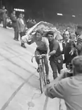 Marcel Janssens and Adolf Christian were in the leading group, while Forestier and Mahé lost considerable time, so Janssens and Christian took the podium places.[20] Anquetil was still leading, and nobody doubted that he would win the race, especially because there was still an individual time trial coming up, Anquetil's specialty. And indeed, Anquetil won that time trial with a margin of more than two minutes.[20]