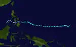 The Japan Meteorological Agency's "best track" does not give windspeeds, only indicating that Patsy was a typhoon.[9] The Joint Typhoon Warning Center's report disagrees on location but also has Patsy's maximum windspeed east of the dateline;[7] the JMA's data does not indicate windspeeds.[9] Patsy is an uncommon west-to-east crosser of the dateline. Including only systems recognized by the Central Pacific Hurricane Center, that has only happened six times since.[10]