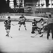 The 1961 Ice Hockey World Championships was the 28th edition of the Ice Hockey World Championships. The tournament was held in Geneva and Lausanne, Switzerland from 1 to 12 March 1961. The games were played outdoors on a frozen pool. A glare made it hard for players to see well, however photographers were able to get aerial pictures from the diving board. Canada, represented by the Trail Smoke Eaters,[1] won their nineteenth international title. It would be the last championship for Canada in thirty-three years.[2] By beating out the Soviets for the Silver, the Czechoslovaks won their tenth European title. The final day was marred by political controversy when Willi Daume, president of West Germany hockey, forbade his team to take the ice against East Germany to avoid the possibility of honouring the East German's new flag.[3]