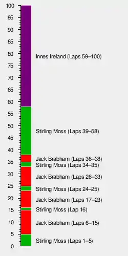 By lap 10, Ireland had already moved up to fourth, behind McLaren's Cooper, as Moss and Brabham continued to draw away at a second a lap, swapping the lead back and forth. At about one-third distance, on lap 34, Brabham's V8 began to leak water and overheat. With puffs of smoke appearing from the left-side exhaust, the Cooper dropped back from Moss and finally entered the pits on lap 45. After taking on water and returning to the race, Brabham completed only seven more laps before retiring.