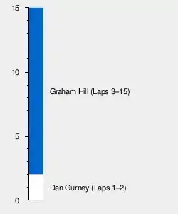 Three new cars appeared - the new BRM V8-engined Gilby, driven by Keith Greene, retired after about half the race with gearbox problems. The Belgian Maserati-engined ENB finished last; this car was a hodgepodge of parts from three old Emerysons equipped with a sharknose-style front end. This was its only appearance, and a hard worked Lucien Bianchi was only allowed to start thanks to the fact that several faster racers had not finished the minimum-required five laps. Gurney's fastest qualifying lap was 8:47.2; the ENB's fastest lap was 10:40.7, nearly two minutes slower.[4] Most importantly, Jack Brabham's new BT3 finally appeared after a marathon effort by his mechanics. He spun the main bearings on the first day practice, and qualified with an engine built using parts from Trevor Taylor's car (his engine bent a valve). He started the race from the rear of the field, with the Climax engine from his Lotus 24. He climbed to ninth place by the end of the first lap, but then his throttle broke and he had to retire after nine laps. Nonetheless, Brabham was happy with the car, particularly the handling.[3]