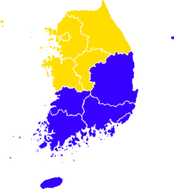 | Jeonnam | 765,712 | (57.2%) | 480,800 | (35.9%) | 51,714 | (3.9%) | 17,312 | (1.3%) | 22,604 | (1.7%) | 1,338,142 | ![]() |