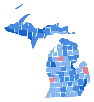 Michigan was won by incumbent President Lyndon B. Johnson (D–Texas), with 66.70% of the popular vote, against Senator Barry Goldwater (R–Arizona), with 33.10% of the popular vote.[4][5] As of the 2020 presidential election, this is the last election in which Livingston County, Allegan County, Antrim County, Grand Traverse County, Midland County, Ionia County, St. Joseph County, Barry County, Newaygo County, Hillsdale County, Emmet County, and Otsego County voted for the Democratic candidate. This is also the best Democratic performance in a presidential election in Michigan to date.