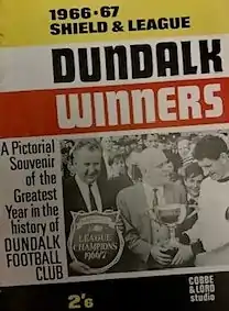 The new season started on 21 August 1966 with the Shield and the Dublin City Cup. Dundalk had never won the Shield in their 40 seasons of League of Ireland membership, being runners-up four times and going close in numerous seasons.[5] At the 41st attempt, the new team made no mistake – with nine wins from the first 10 matches, effectively sealing the win with a 2–0 victory over Shamrock Rovers in front of a then record crowd of 14,000 for a domestic game in Oriel Park.[6][7] 10 days later they met Shamrock Rovers again, this time in the City Cup final, but fell to a 2–1 defeat.[8]
