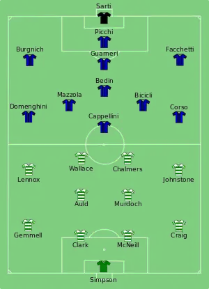 After just over an hour, Gemmell finally managed to equalise for Celtic when Craig passed to him from the right wing and he scored with a powerful 25 yard shot.[17] The balance of play remained the same with Inter defending deeply against sustained Celtic attacking. With about five minutes remaining, a long-range shot from Bobby Murdoch was diverted by Stevie Chalmers past a wrong-footed Sarti – rather than an instinctive intervention, Chalmers and his teammates asserted that they had practiced the same move many times in training.[18] This proved to be the winning goal.[19][20]