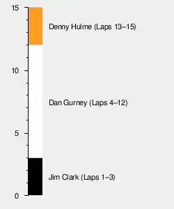 Clark converted his pole position into an early lead, while his Team Lotus team-mate Graham Hill was pushed from his grid position of 13th, onto some grass, restarting the back of the field, behind the F2 cars. Clark stayed ahead Hulme and Gurney for the first three laps of the race. On the fourth lap, Clark dramatically slowed, his suspension having buckled, and so ended his race. Hill managed his Lotus up to tenth before mechanical troubles eventually put him out of the race.[1]