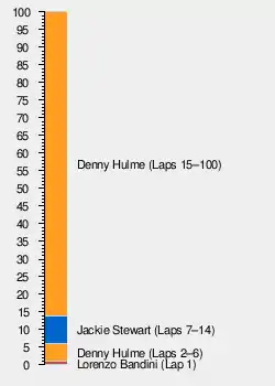 Meanwhile, Hulme continued to lead the race to the finish unchallenged. With just eight laps to go, Amon suffered a puncture and dropped to third, with second going to Hill.[3][4]