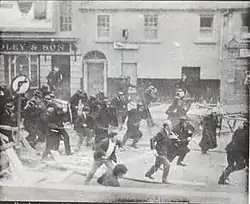Loyalist crowds armed with petrol bombs, bricks, stones, sharpened poles and protective dustbin lids gathered at Dover and Percy Streets.[26] On Dover Street, the loyalist crowd was led by Ulster Unionist MP John McQuade.[27] They included a rowdy gang of loyalist football supporters who had returned from a match.[28] The loyalists began moving down these streets into the Catholic district, attacking Catholic homes and businesses. They were confronted by nationalists, who had hastily blocked their streets with barricades. Fighting broke out between the rival factions at about 11 pm.[29] Catholics claimed that B-Specials had been seen giving guns to the loyalists,[11] while journalists reported seeing pike-wielding loyalists standing among RUC officers.[30] On Percy Street, a loyalist opened fire with a shotgun,[26] and B-Specials helped the loyalists to push back the nationalists.[19]
