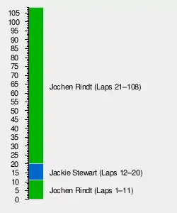 As they had many times during the season, Rindt and Stewart quickly separated themselves from the rest of the field. On lap 12, Rindt slid wide and allowed Stewart through. The Matra's engine was not running at full strength, however, and it was all Stewart could do to hold off the Austrian, who was bobbing and weaving on both sides, trying to get by. Rindt finally got past on the straight on lap 21, and eventually, the Scot began to fall back.