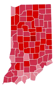 Nixon carried Indiana with 66.11% of the vote to McGovern's 33.34%, a victory margin of 32.77%. Although Indiana is one of the most reliable Republican states in the country, this is the only occasion where a Republican candidate (indeed, where any Presidential candidate) carried every county in the state.[1] As of the 2020 presidential election, this is the last time a Republican won Democratic-leaning Lake County in the northwestern corner of the state.[2]