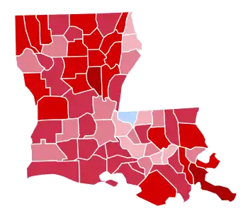 Nixon carried Louisiana with 65.32% of the vote to McGovern's 28.35%, a victory margin of 36.97%, making Louisiana 13.8% more Republican than the nation-at-large. In a state that would reflect McGovern's national results, the Democratic candidate only won one parish (West Feliciana) in Louisiana. As of the 2020 presidential election, this is the last election when Iberville Parish, Madison Parish, St. James Parish, St. Helena Parish, and East Carroll Parish voted for a Republican presidential candidate.[1] This is also the last time the city of New Orleans has voted Republican.