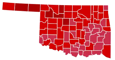 Nixon carried with over sixty percent of the vote all seventy-seven counties in the state, four years after he had won the Sooner State despite finishing behind both Democrat Hubert Humphrey and American Independent George Wallace in Love, McCurtain and Pushmataha Counties.[2] American Independent John G. Schmitz was the only other candidate on the ballot, and he received 2.30 percent of the vote, although managing over eleven percent in the Panhandle county of Cimarron. Nixon's feat of winning every county in Oklahoma would not be achieved by a Republican again until George W. Bush in 2004 (since then, however, every county has stayed in the GOP column in presidential elections). This was the last time until 2004 that Hughes County and Haskell County voted Republican in a presidential election.