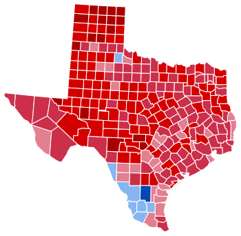 McGovern's only county wins came from the south Texas region along the U.S.-Mexico border and Cottle County in the northern part of the state, though even his performances here were underwhelming. In fact, in the oldest extant Democratic stronghold in the entire United States,[3] Nixon became the solitary Republican since Theodore Roosevelt carried the county in 1904 to win La Salle County, the only Republican since Herbert Hoover in 1928 to carry Hidalgo County,[lower-alpha 1] the only Republican since Dwight D. Eisenhower in 1952 to win Dimmit County, one of only two Republicans since the county was founded in 1911 (following Eisenhower in 1956) to carry Jim Wells County and the only Republican apart from Eisenhower's two victories there to win Wilacy County since it was created in 1921. This is also the last election at which Zavala County has voted Republican,[3] though that county did so even in 1960. Duval County, however, gave McGovern over 85 percent of the vote, which was the highest percentage of votes he received in any county nationally.[4] 1972 was the third successive election when Duval proved the most Democratic county in the nation. Taking the region of South Texas to include all the above-mentioned counties (La Salle, Hidalgo, Dimmit, Jim Wells, Wilacy, Zavala, & Duval) as well as Maverick, Frio, Webb, Zapata, Jim Hogg, Starr, Brooks, Cameron, Kenedy, Kleberg, Nueces, and San Patricio, Nixon is to date the only Republican or non-Democrat to win a majority of said counties since Texas achieved statehood in 1848.