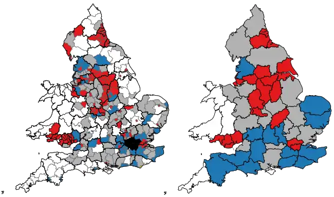 ![]() Map of the results of the elections in England and Wales, showing party control by district (left) and county (right). | |||||||||||||||||